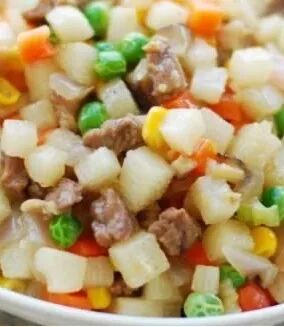 碟头饭套餐:优质晚造米饭、菠萝鸡粒炒饭、炒圆椒肉丝、手撕包菜、番茄土豆肉碎汤、冬枣。