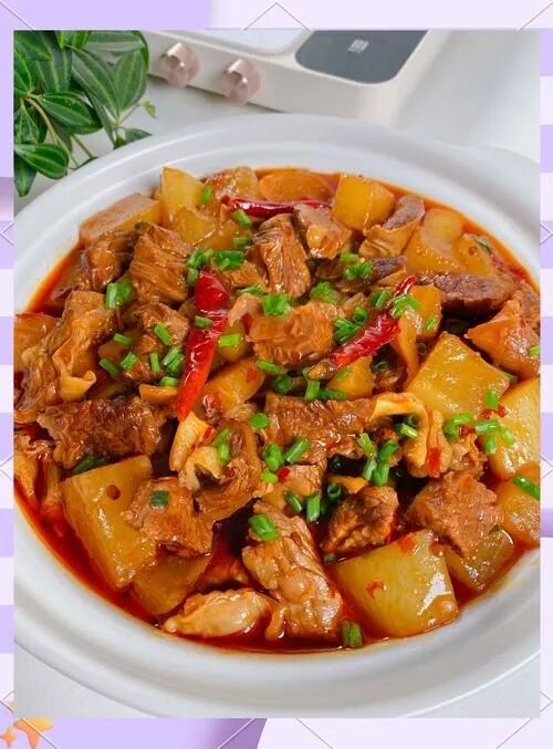 广式营养套餐:黄咖喱焖鸡、沙葛炒肉片、鱼香茄子、大白菜、番茄肉碎汤、西瓜。