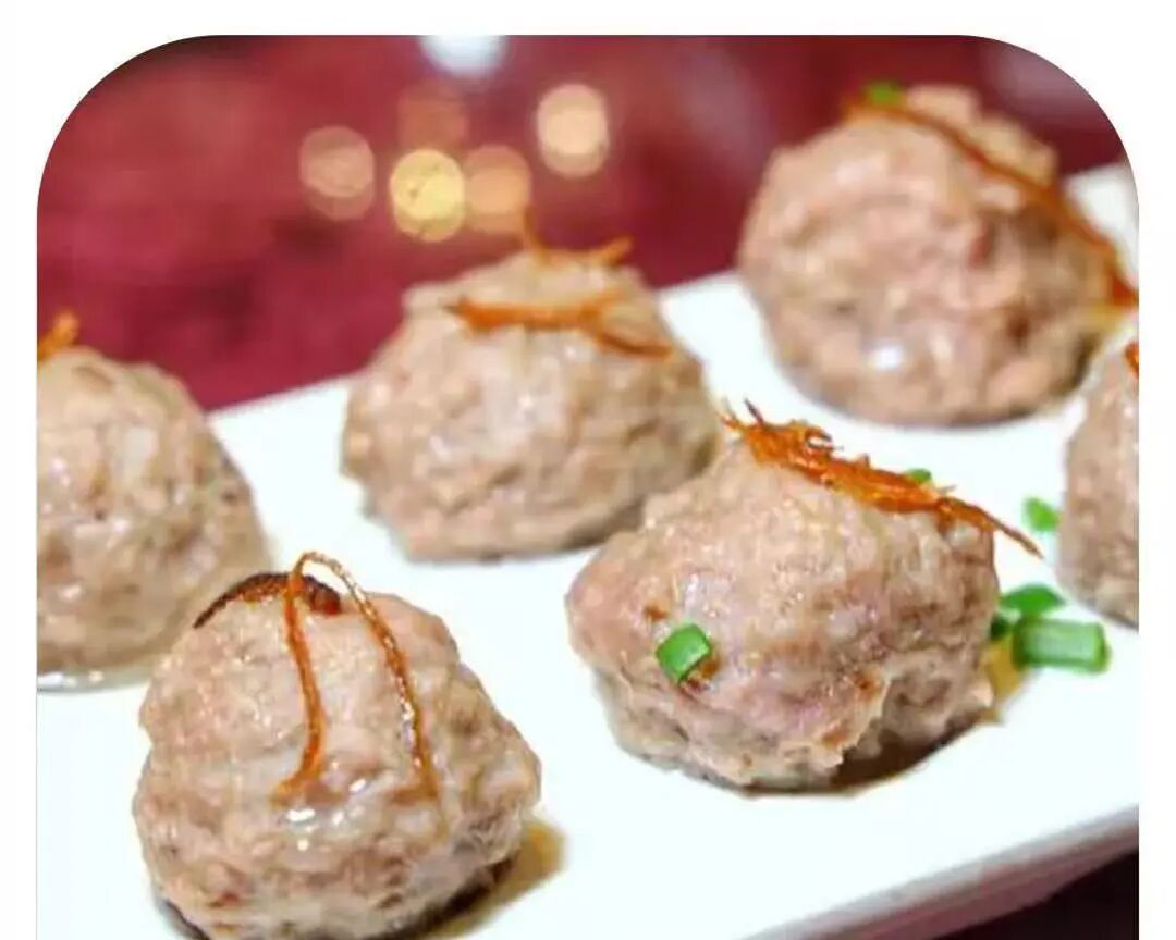 广式营养套餐:芫荽蒸肉球、冬瓜炒肉片、豆芽菜煮油豆腐、奶白菜、红豆沙、三华李。