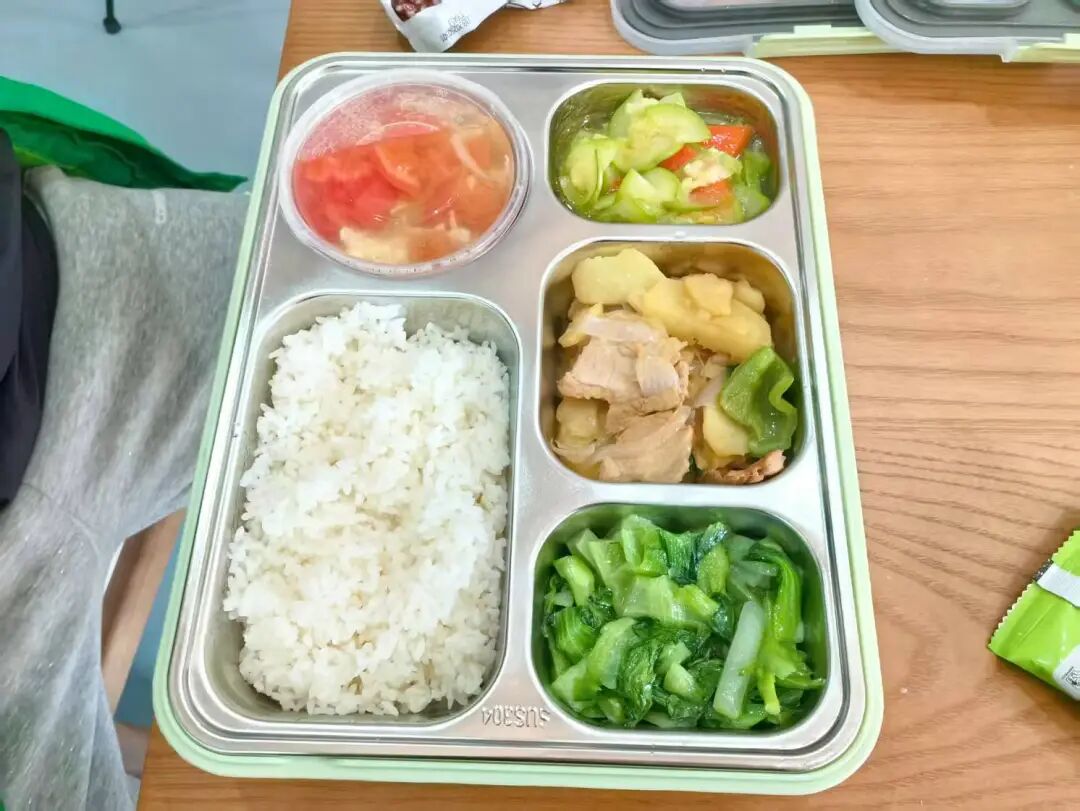 凑近一看,今天的菜是花菜炒肉片、炒时蔬、炒青菜和番茄蛋花汤,荤素搭配的套餐仅需10元。