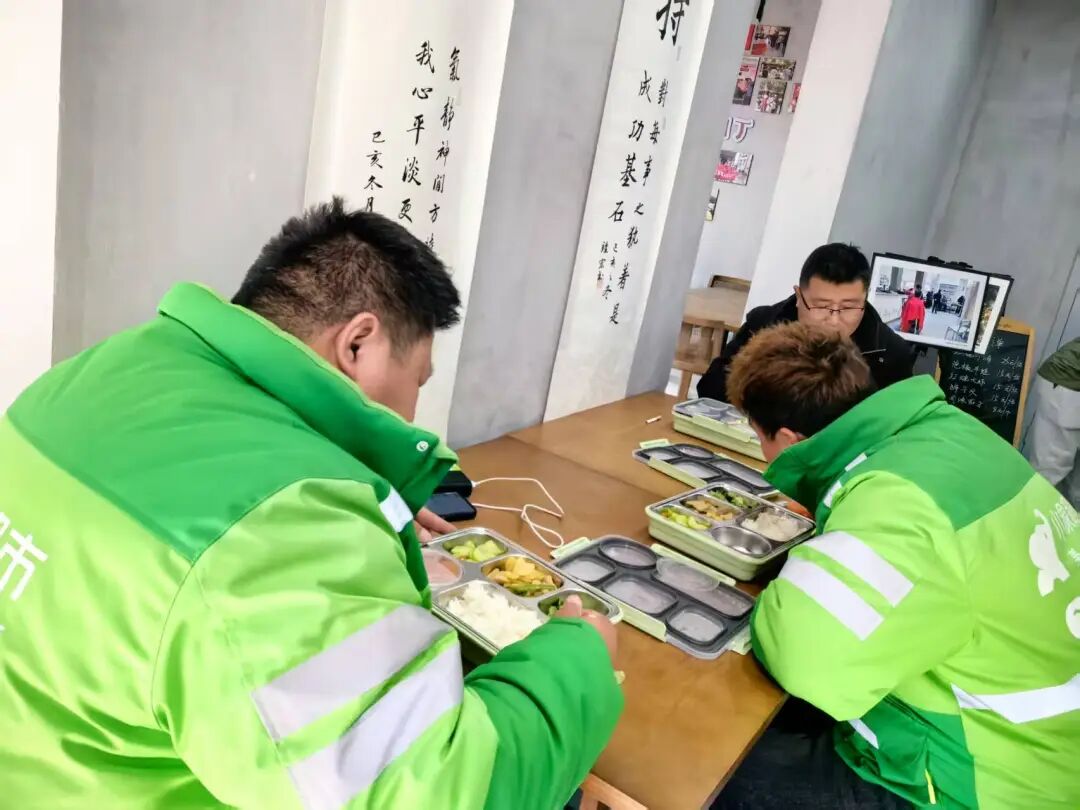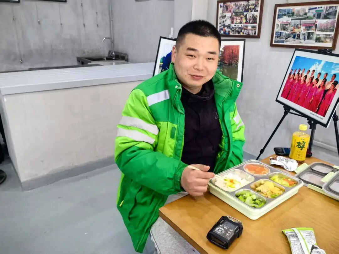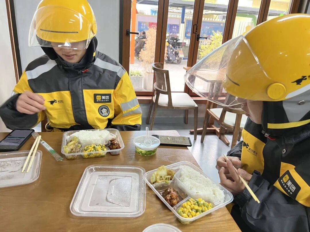 "以前送完单只能在电动车座垫上扒两口冷饭,现在终于能吃口热乎的了,吃完还能休息一会儿。"