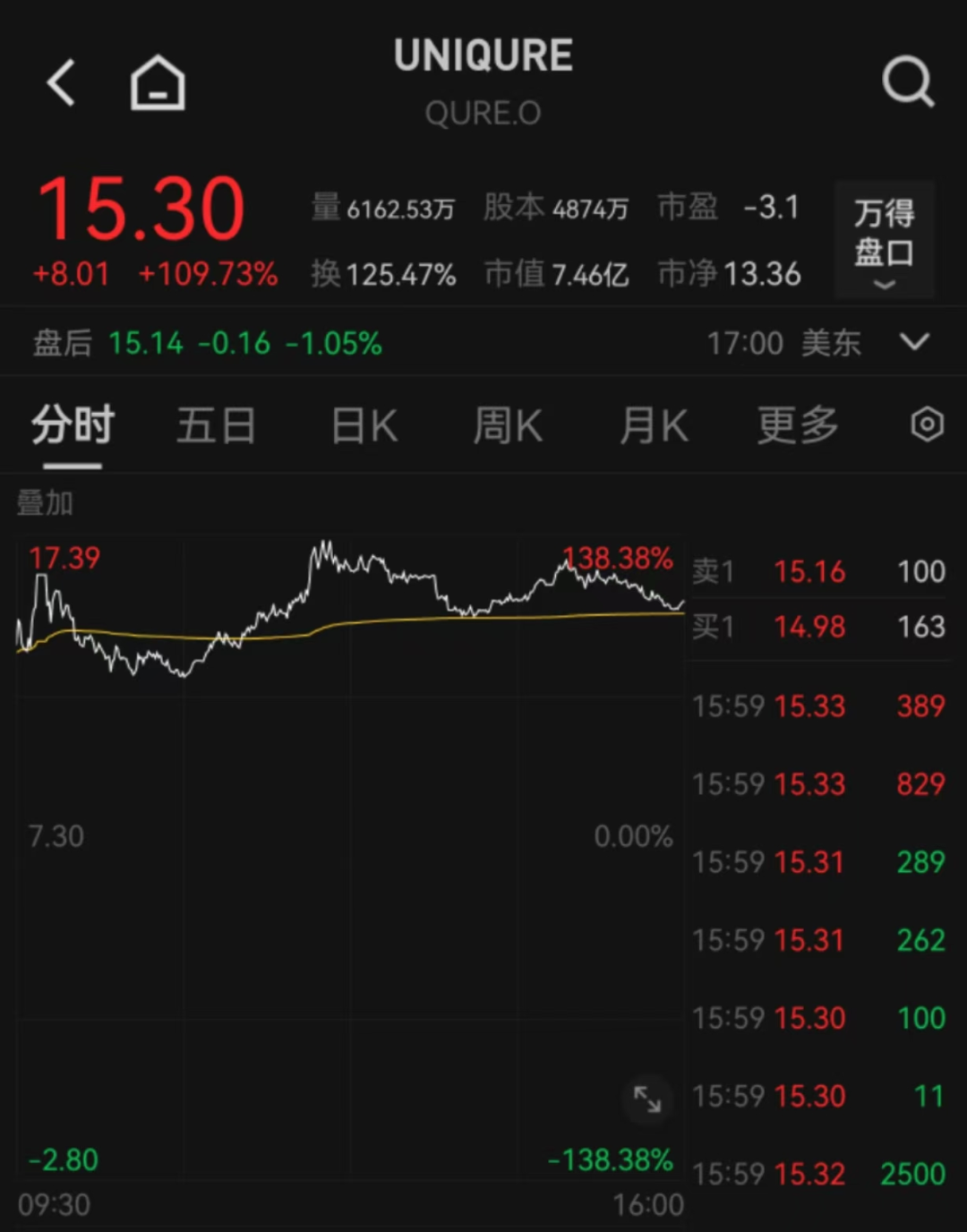 当地时间12月10日,从事基因罕见病领域治疗的制药公司uniQure开盘飙升,涨幅一度超138%,盘中触发熔断。截至收盘,其涨幅为109.73%,报15.30美元,最新总市值为7.46亿美元。