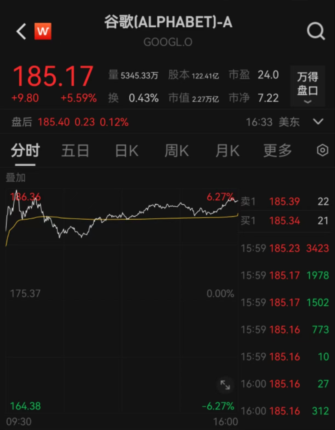 谷歌母公司Alphabet开盘后迅速走高,随后高位震荡。截至收盘,其涨幅为5.59%,报185.17美元,最新总市值为2.27万亿美元;盘中最高触及186.36美元,逼近其191.277美元的历史高点。
