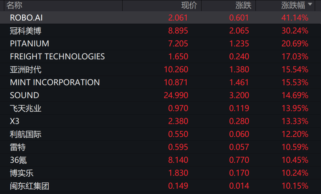 多只中概股狂飙,ROBO.AI涨幅超41%,冠科美博涨超30%,36氪、X3等涨幅超10%。热门中概股方面,哔哩哔哩涨超8%,阿特斯太阳能、小马智行、理想汽车涨超7%,蔚来、小鹏汽车涨超3%。
