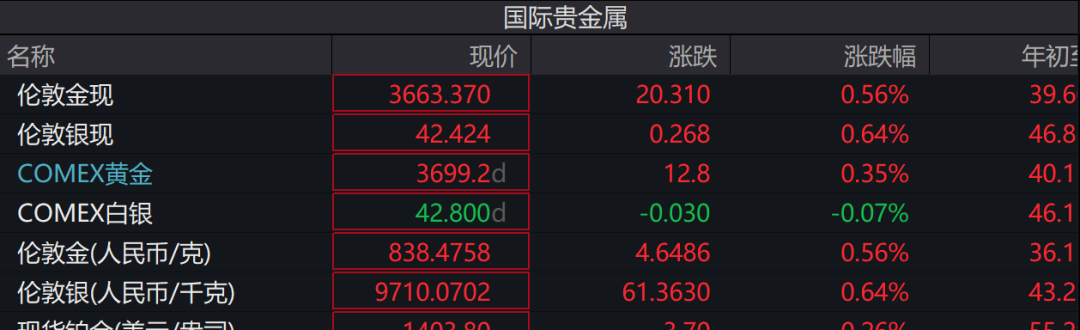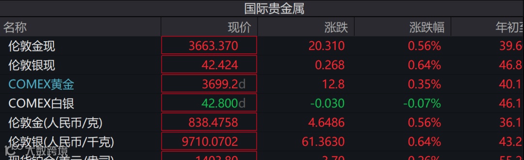 在避险情绪下,美国国债价格小幅上涨,10年期国债收益率下降一个基点至4.06%。现货黄金向上触及3663美元/盎司,日内涨0.56%。