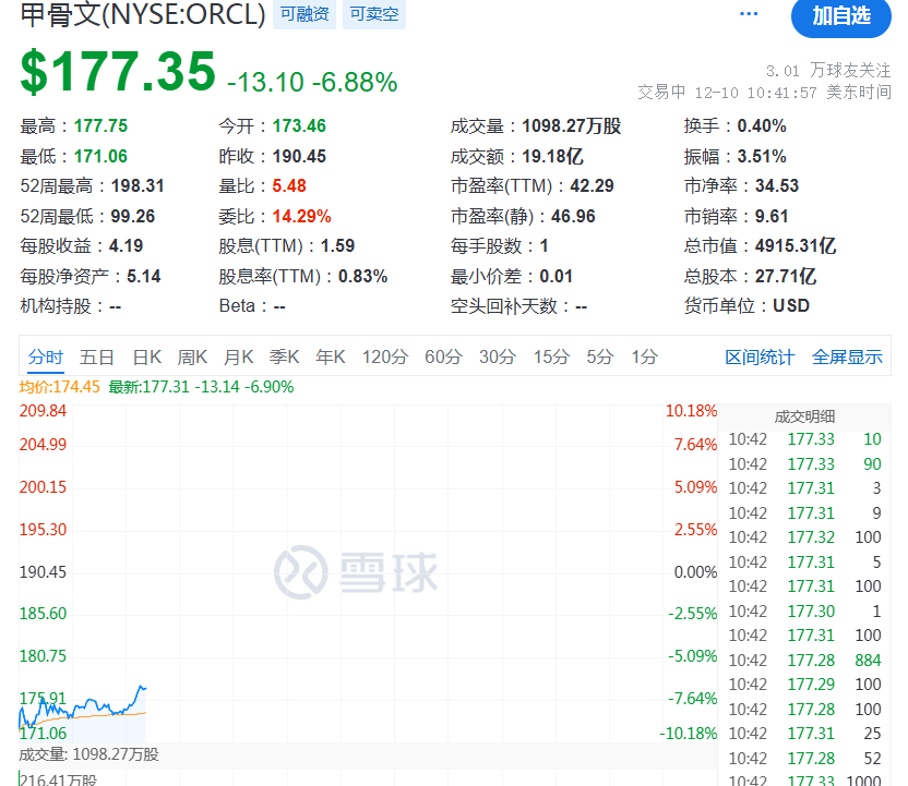甲骨文公司股价大跌。消息面上,该公司财季收入和利润双双增长,但不及分析师预期。