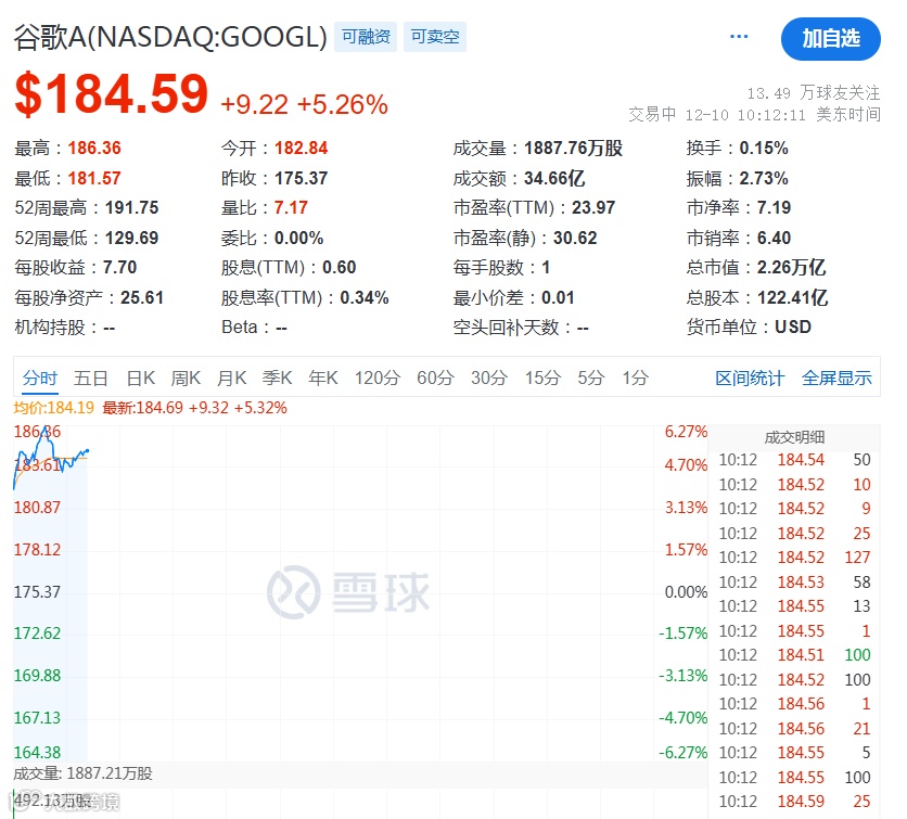 12月10日晚间,美股开盘,市场的目光聚焦在谷歌身上,其股价今晚大涨超5%!
