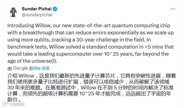 谷歌表示,其使用新一代Willow量子芯片的计算机在运行基准算法时击败了世界上最快的Frontier超级计算机,仅需几分钟完成的任务,Frontier需要10,000,000,000,000,000,000,000,000年(10亿亿亿年)才能完成——远远超过宇宙的年龄(138亿年)。这与谷歌五年前宣布的性能相比有了指数级的提升。当时,他们表示可以在几分钟内完成需要超级计算机1万年的任务。