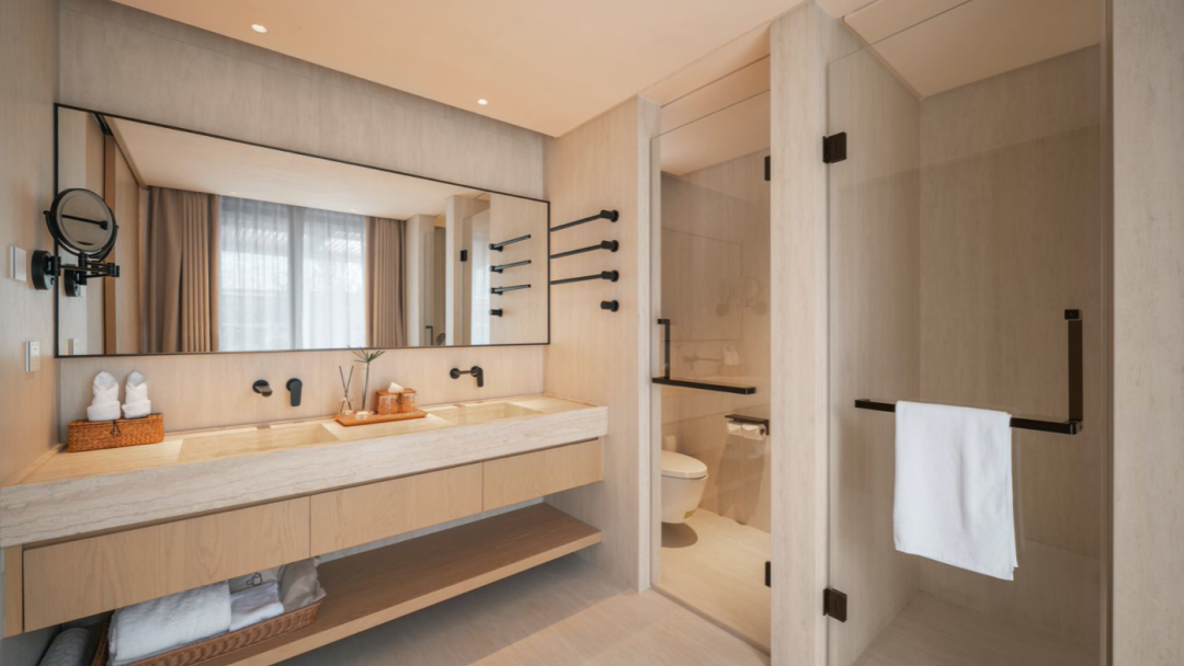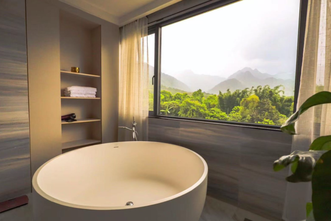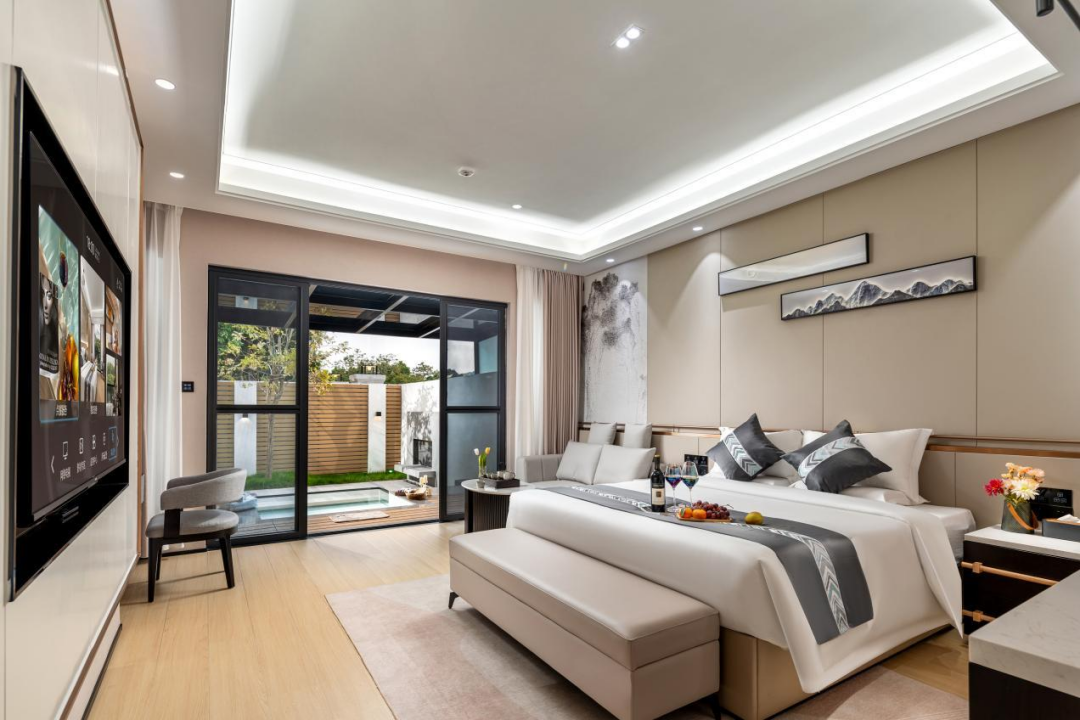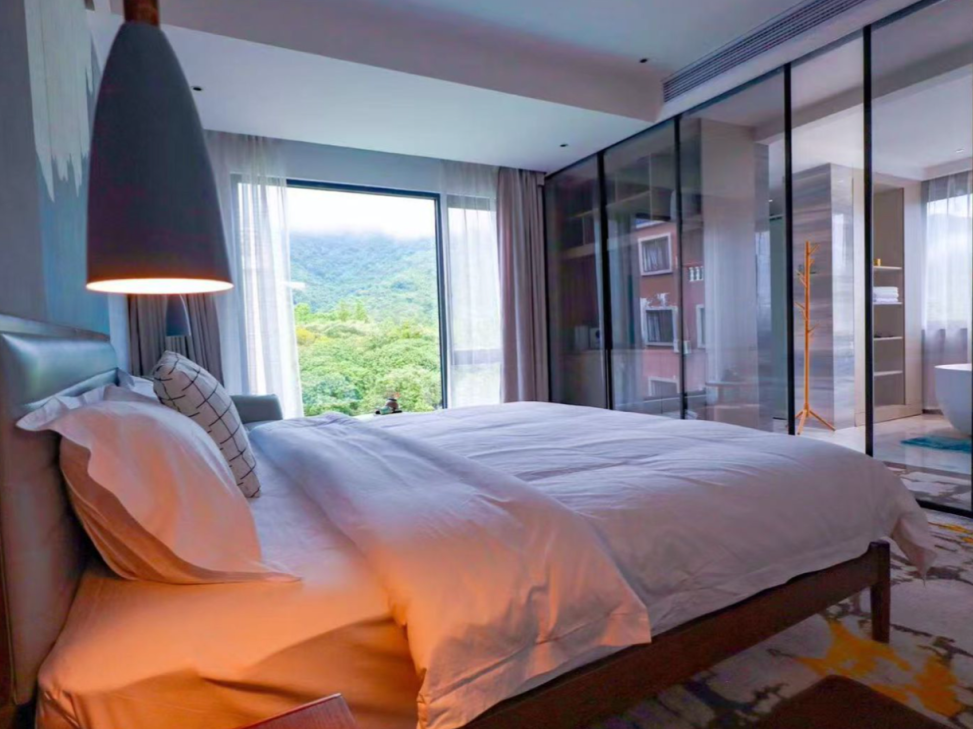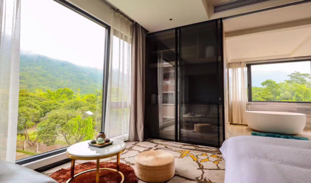 设计风格以现代轻奢风为主,房间面积约40-50㎡,空间宽敞,房间舒适。房间以五星级酒店标准,电动窗帘,智能马桶,浴缸等,落地窗可欣赏看瀑布和山景,与自然相呼应。室外公共区域有无边泳池、花园、书吧、特色大堂吧等。