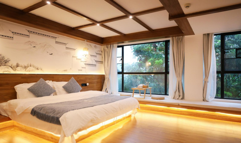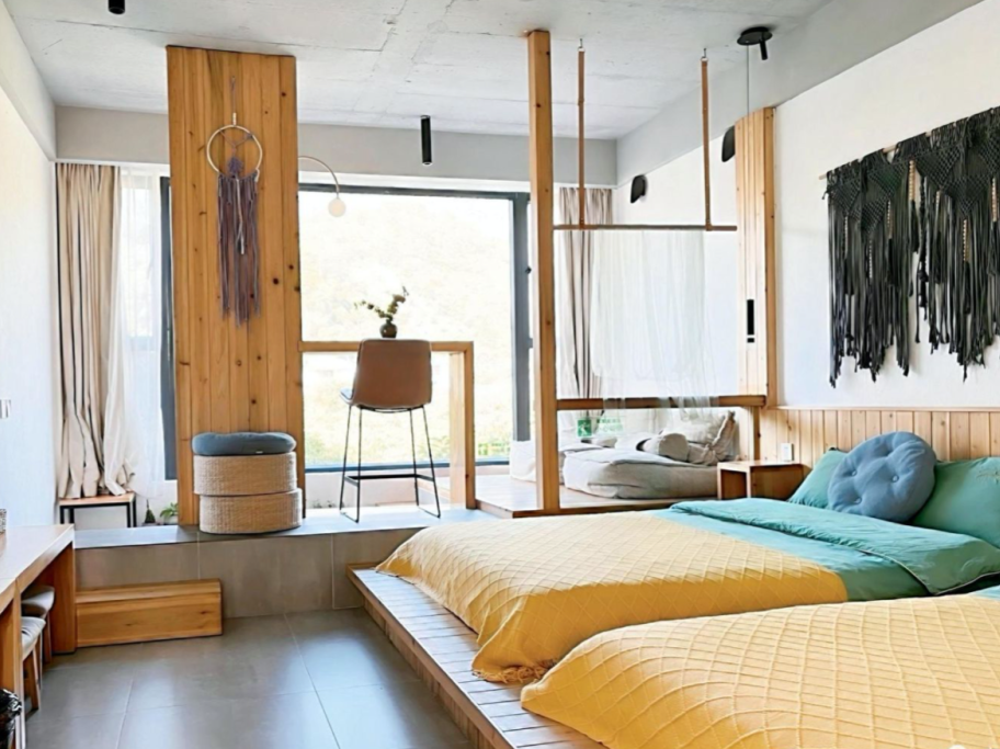民宿以“木艺+自然”为内核,开设木勺雕刻、原木筷子制作等手作课程,22间客房融合高端设施与生态私密。