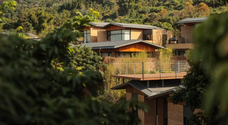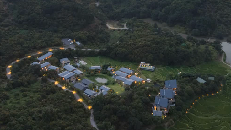酒店的规划建筑景观设计由line+联合创始人、主持建筑师孟凡浩操刀,以 “ 隐居林野,重归聚落” 为理念,利用山林、水体和梯田本身的错落高差,对于酒店公区、客房进行灵活布局。