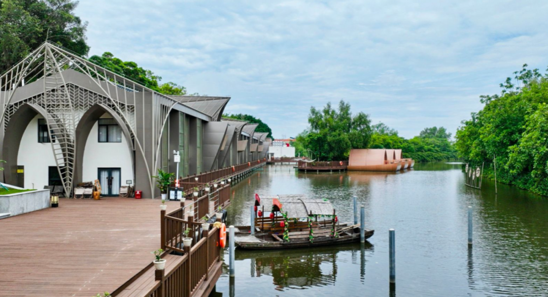 整体建筑为岭南文化风格,嵌入疍家文化和传统文化元素,共两层,总面积约2000㎡,业务涵盖住宿、餐饮、会务、研修及休闲观光度假产品等。