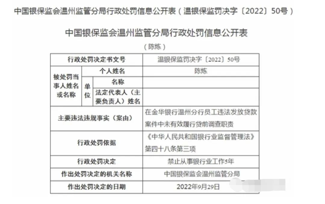 10月12日,银保监会温州监管分局披露的罚单显示,在金华银行温州分行员工违法放贷案件中,陈某因未有效履行贷前调查职责,被禁止从事银行业工作5年。