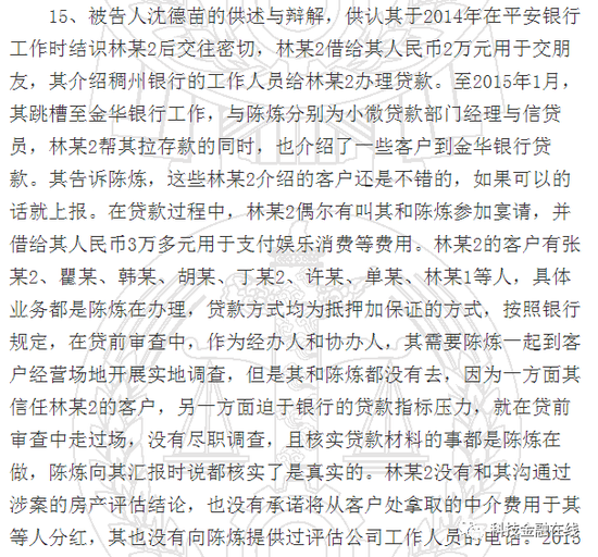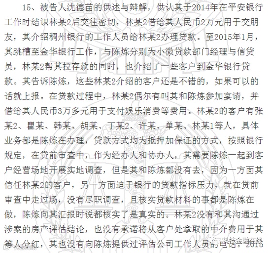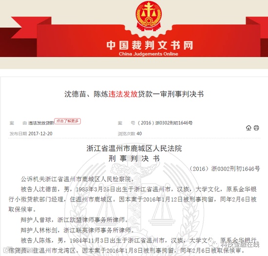 判决书显示,曾就职于平安银行的沈某跳槽到金华银行后,便将在民泰银行工作的陈某推荐到该行。2015年1月开始,二人进入金华银行温州分行共事,沈某担任金华银行小微贷款部门经理,陈某则是部门下属的信贷员。