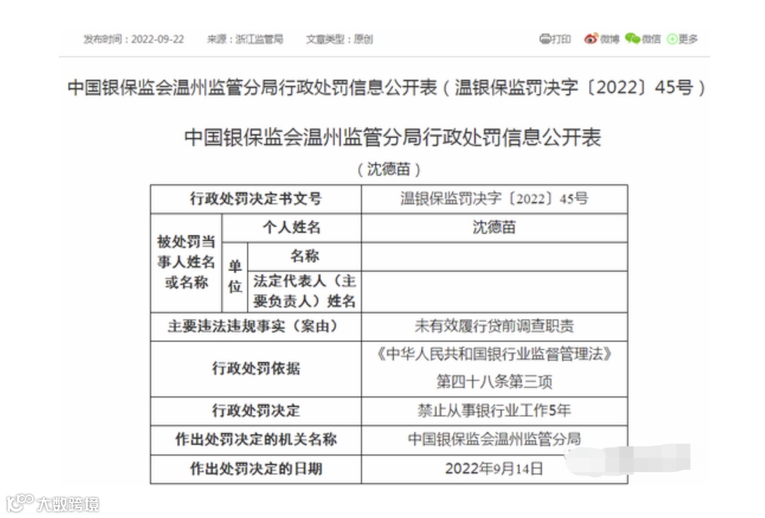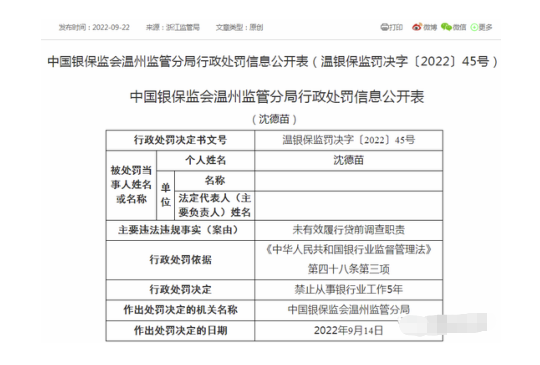 而早在9月22日,温州监管分局还披露过一张罚单显示,沈某因未有效履行贷前调查职责,被禁止从事银行业工作5年时间。