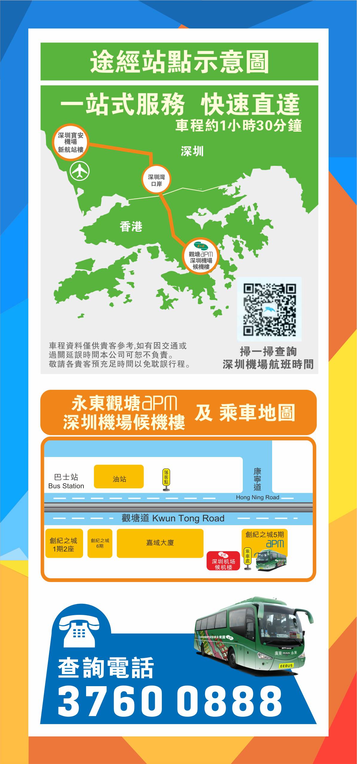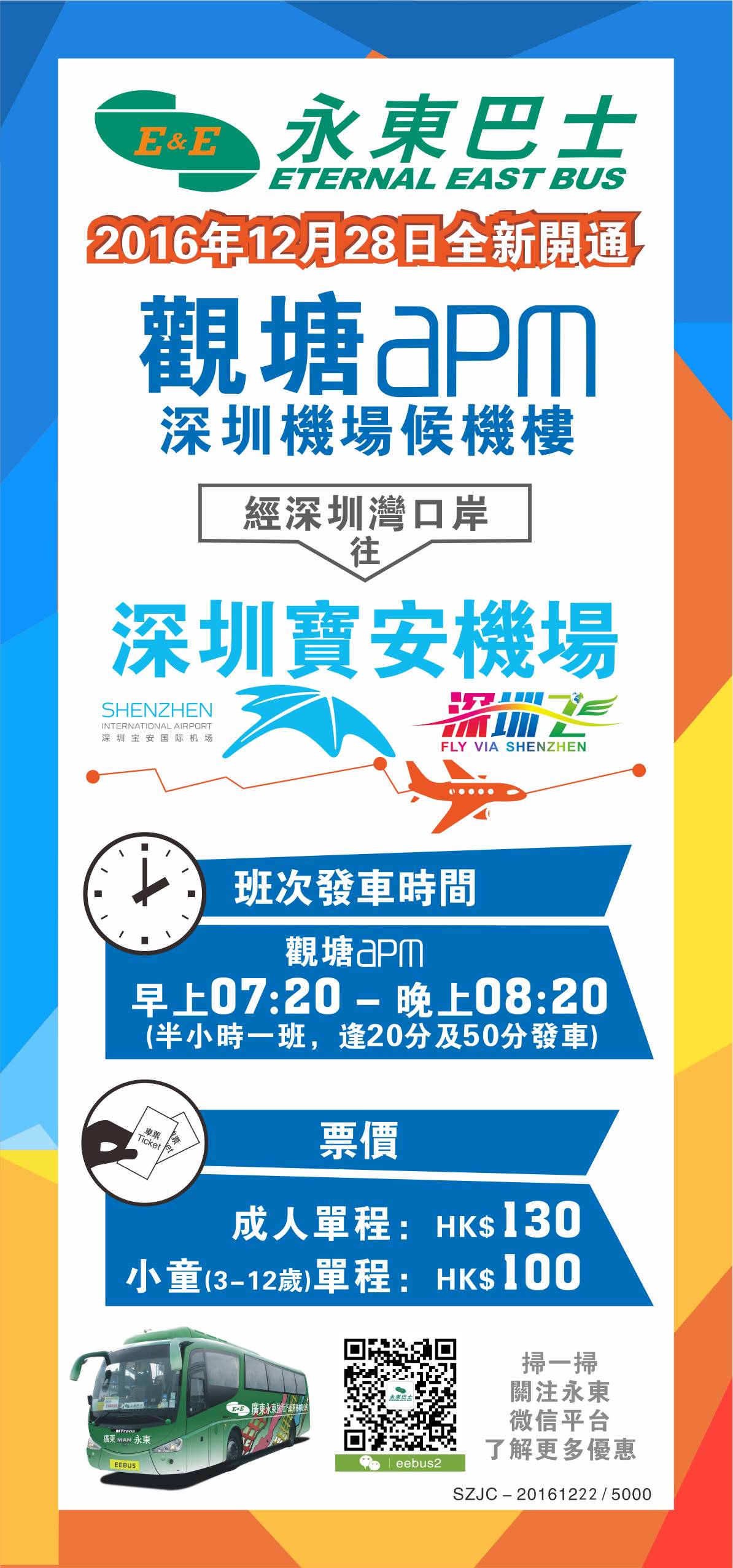 导读:永东观塘apm站设有专线经深圳湾前往深圳机场新航站楼,每天27班, 并开设即场深圳机场预办登机服务, 一站式