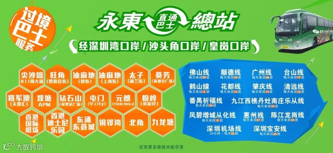 永东巴士为旅客提供广东省各地区往返香港跨境巴士服务, 线路广泛编佈整个广东省, 每天来回班次多达600多班, 是您出行的最佳伴侣。