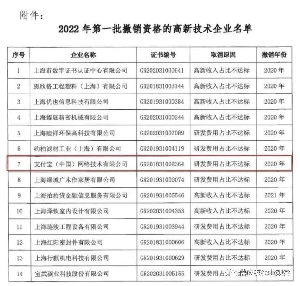 此外,近期,上海市高新技术企业认定指导小组公告了2022年第一批撤销高新技术企业资格企业名单,撤销年份在2020年和2021年,包括上海数字证书认证中心有限公司、上海优也信息科技有限公司、支付宝(中国)网络科技有限公司、上海行麒机电科技有限公司在内的14家企业在名单中。其中,支付宝(中国)网络科技有限公司的取消原因显示为:研发费用占比不达标。