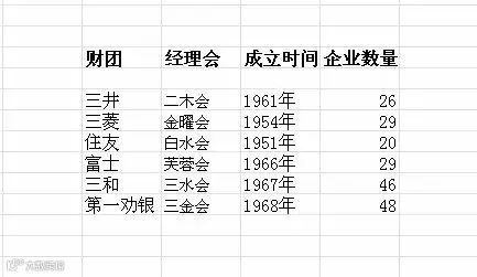 日本六大财团,前三者是直接继承二战前财阀谱系的集团,大约在上世纪50年代前后形成,不但金融体系健全,而且更有发达的综合商社;后三者是在战后日本经济发展过程中,以主办银行为中心于60-70年代形成,综合商社的功能相对较弱。这些大财团横跨各产业,构成日本经济的基础,掌握着国家的经济命脉,并对国民经济有着重要影响。至70年代初,被解散的日本财阀系统的企业逐步完成垄断资本集团的聚合,其共同特点是: