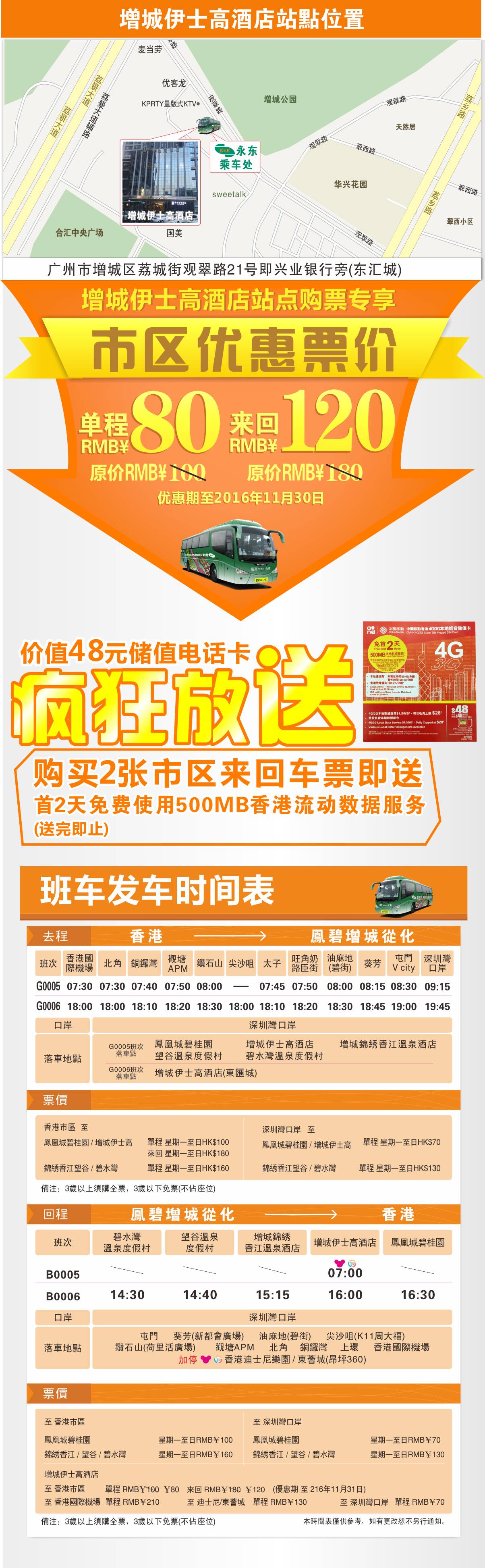 10月1日凤碧增城从化线全新改造, 增城区新增站点伊士高酒店, 班次增至每天来回4班, 于增城伊士高酒店站点购票往香港市区享优惠票价及送价值HK$48香港诸值电话卡!