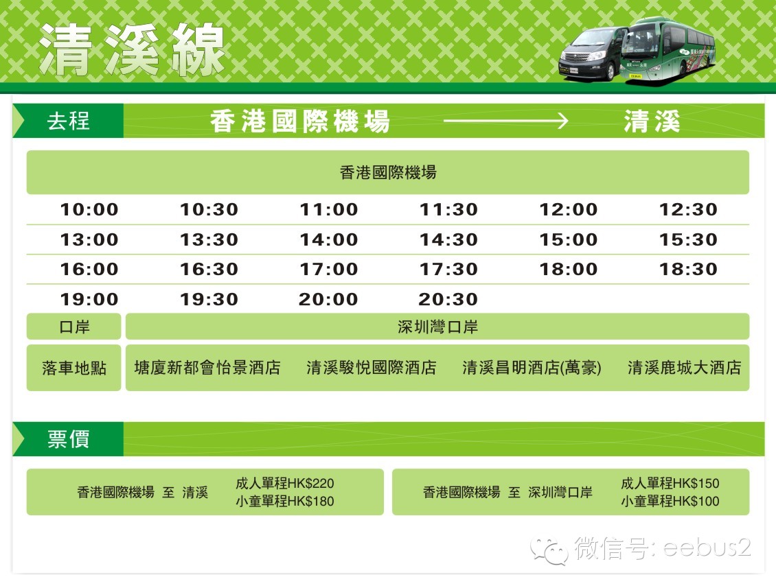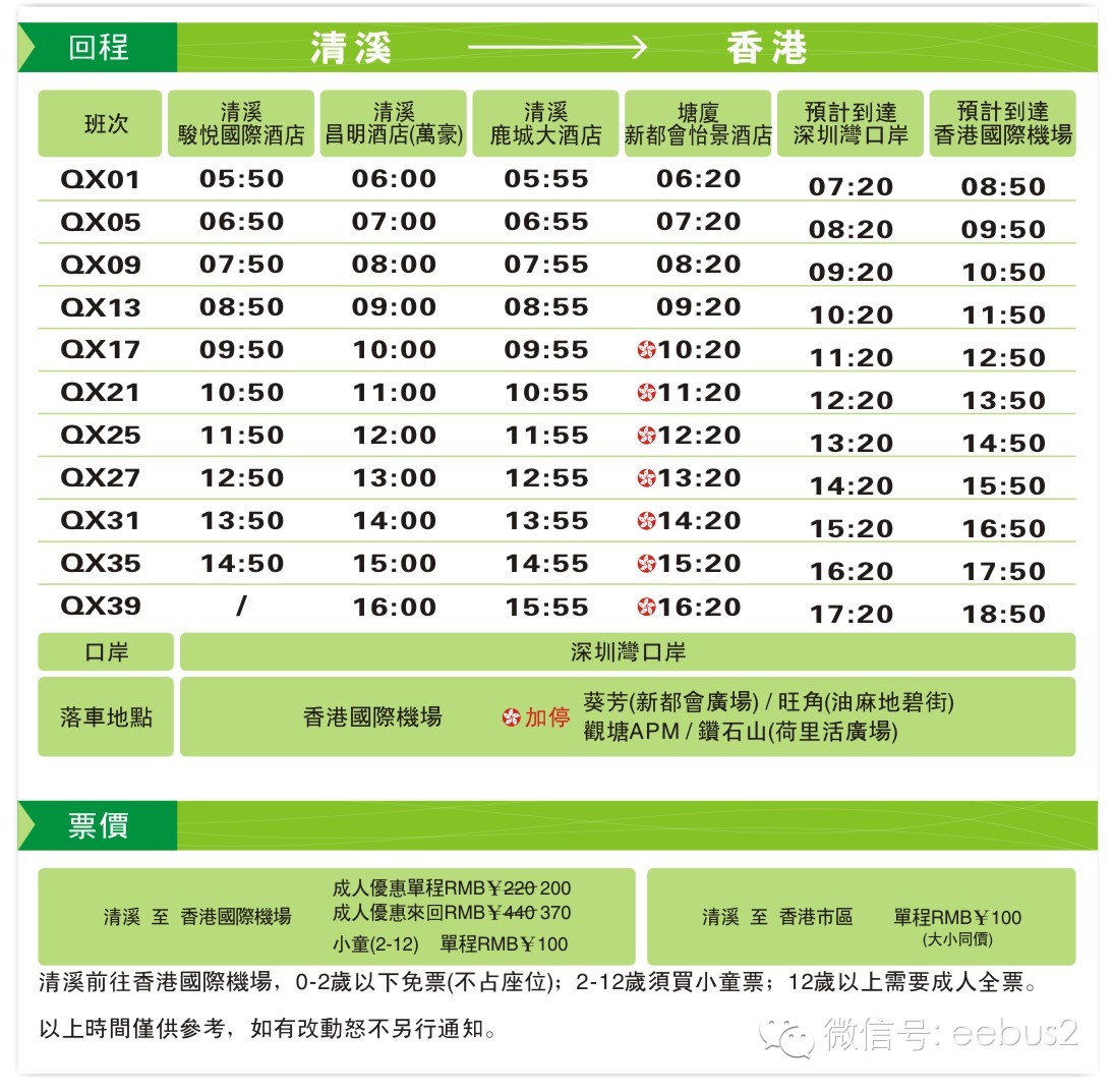 香港 ←→东莞清溪线(清溪骏悦国际酒店、清溪鹿城大酒店、清溪昌明酒店、塘厦新都会怡景酒店)班次频密,站点齐全,每天来回33班次!