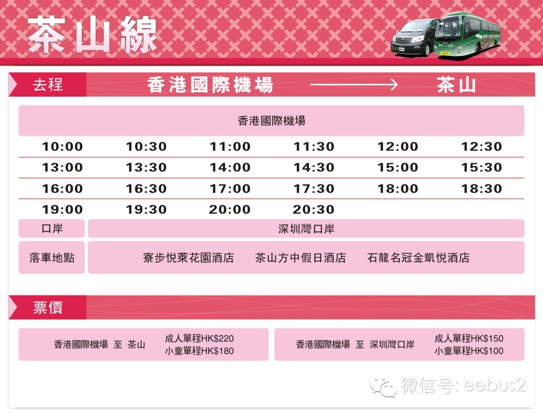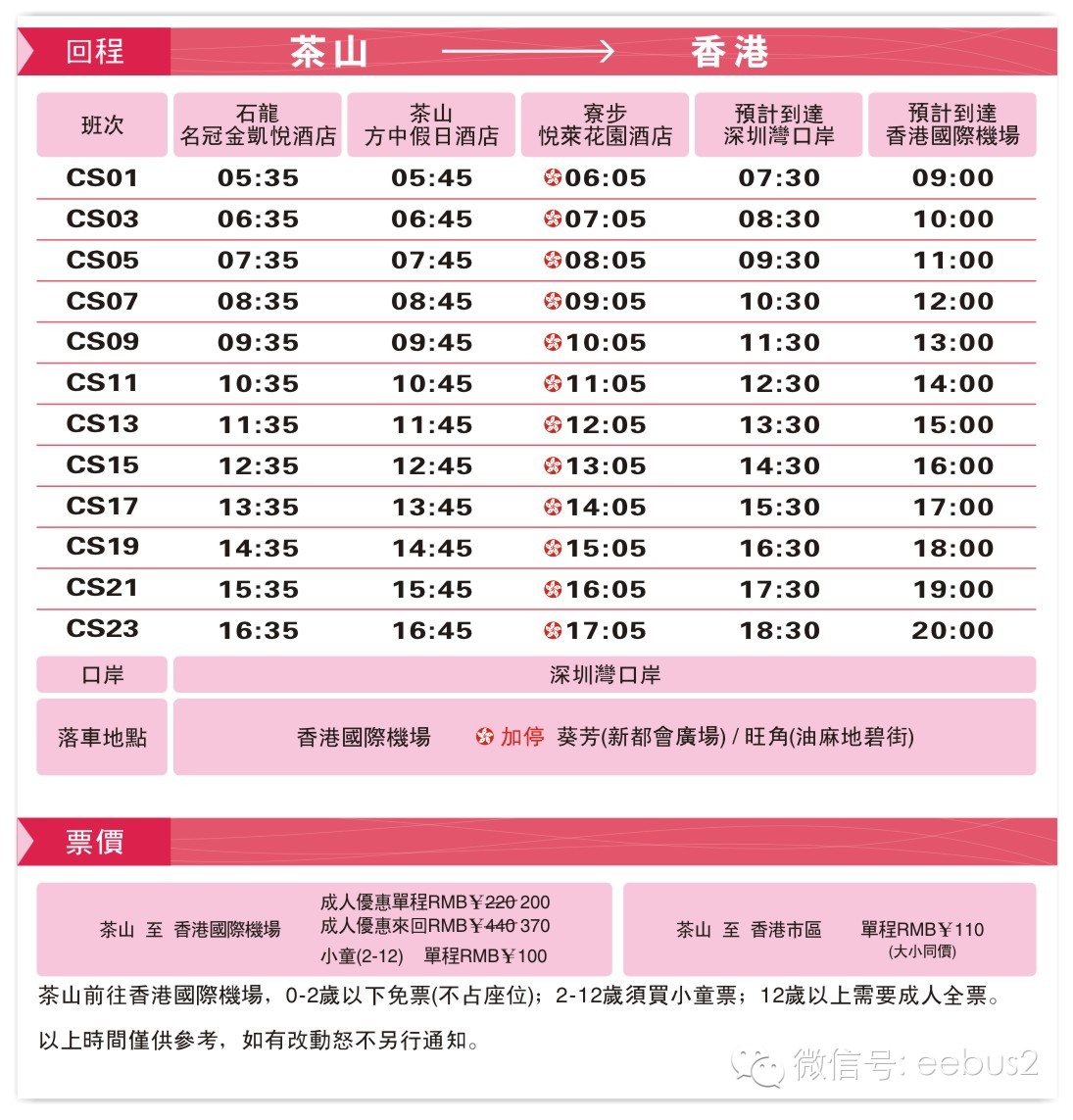 香港 ←→东莞茶山线(石龙名冠金凯悦酒店、茶山方中假日酒店、寮步悦来花园酒店)班次频密,站点齐全,每天来回34班次!