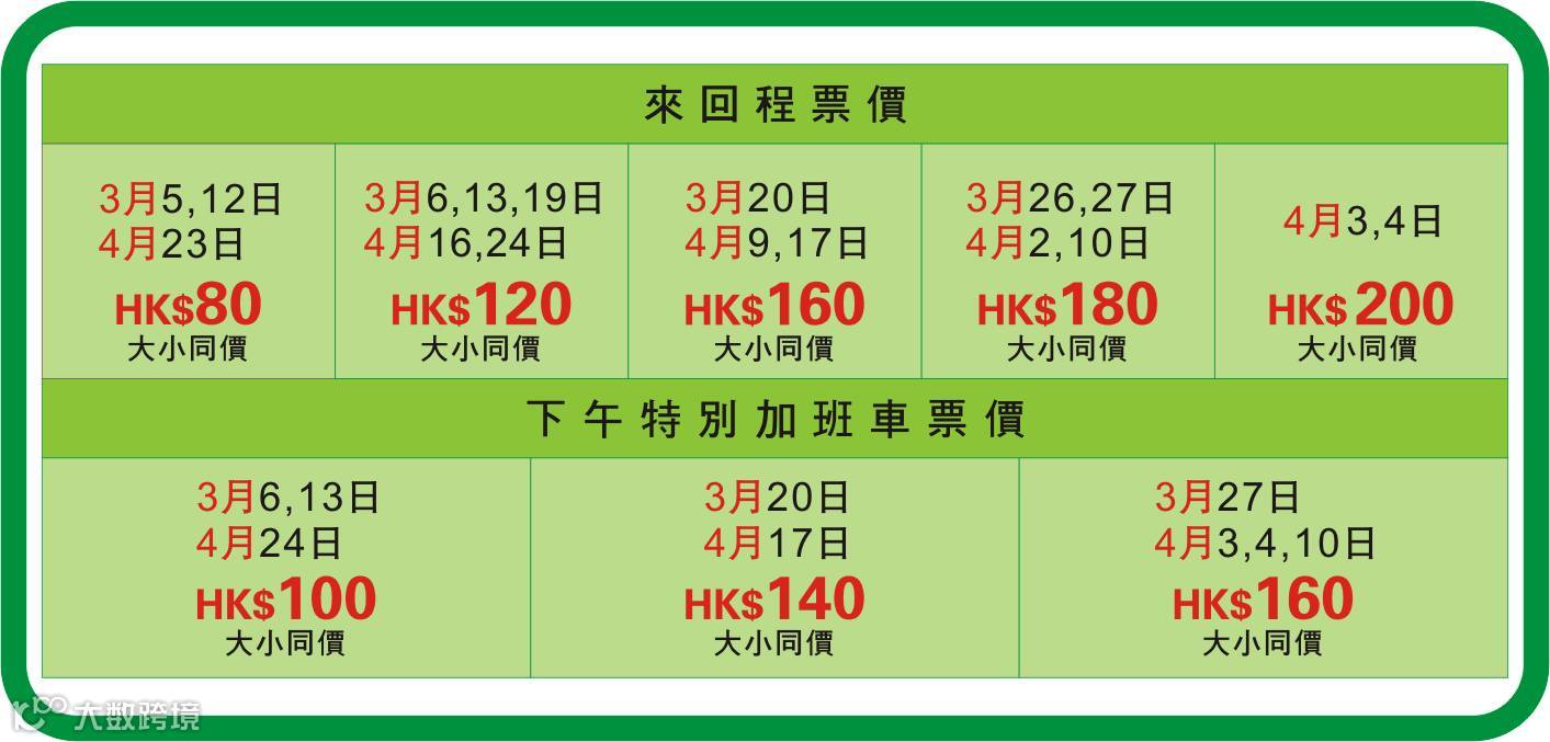 ★0-2岁不占座位需购HK$20幼童车票;足2岁或以上需购成人全票。