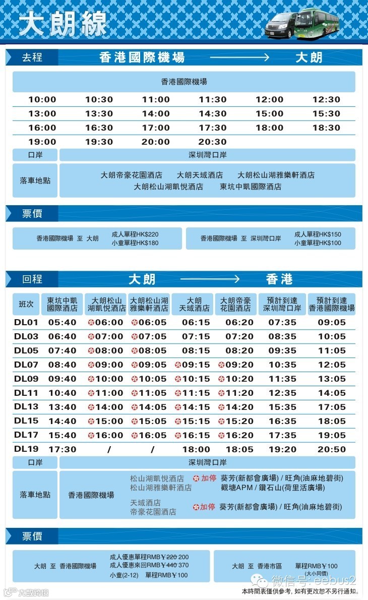 香港←→大朗(帝豪花园酒店、天域酒店、松山湖雅居乐酒店、松山湖凯悦酒店、中凯国际酒店)每天来回32班次。