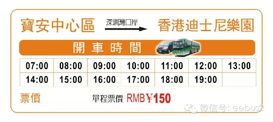 宝安中心区 →香港迪士尼乐园,每天早上07:00到晚上19:00, 约60分钟一班,班次频密;经深圳湾口岸,方便、舒适、快捷。