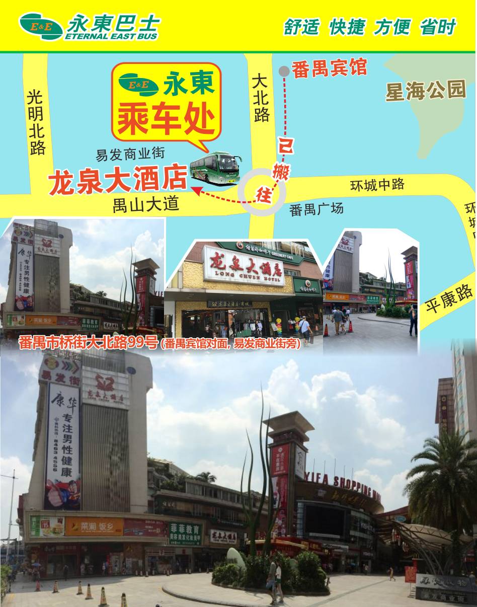 番禺宾馆站点已搬往龙泉大酒店, 新站点位于番禺区市桥街大北路99号(番禺宾馆对面, 易发商业街旁), 地点更加方便. 庆祝乔迁之喜,香港及国内购票齐齐享超级优惠!