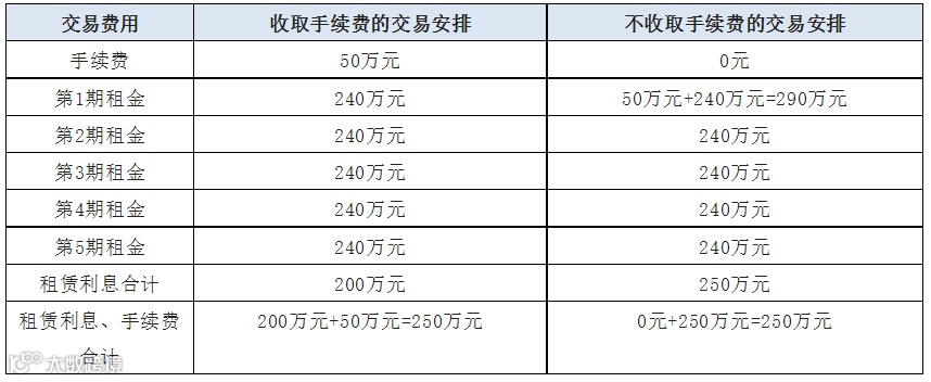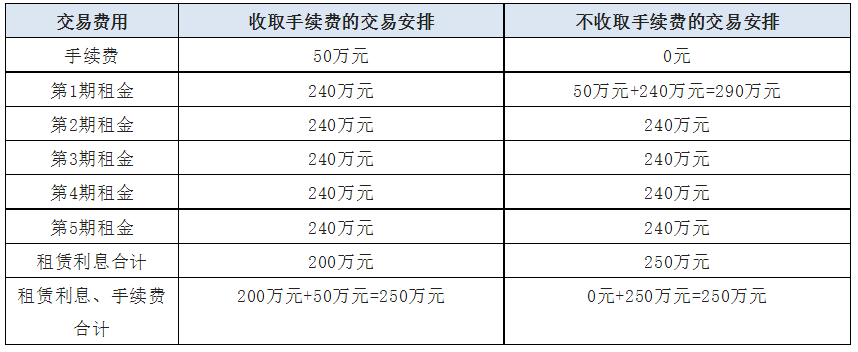 在金融租赁公司尽可能避免收取手续费的合规要求背景下,实务中,金融租赁公司一般采取将原计划收取的手续费转化为首期租金的交易结构,解决直接收取手续费的合规性问题。例如,某融资租赁交易的租赁本金为1000万元,每期租金240万元,合计5期,出租人计划收取50万元手续费,上述50万元的手续费可以调整为首期租金,且调整后出租人的实际收益不发生变化。笔者将上述交易下收取手续费、将手续费调整为租金的两种交易安排,及出租人的收益情况以下表进行列示: