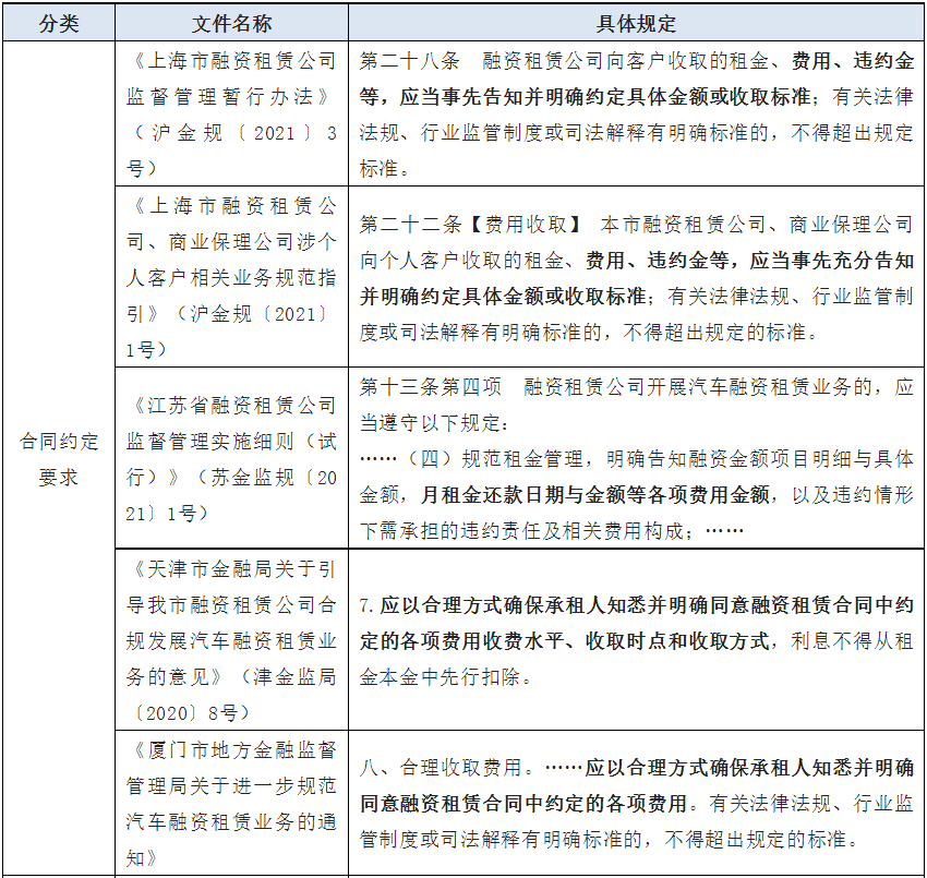 从监管角度而言,针对汽车融资租赁业务、面向自然人开展的融资租赁业务等,地方监管部门可能通过发布通知、指引等形式,对出租人收取手续费的合规事项作出规范。根据笔者的梳理及总结,相关监管要求主要包括收取的手续费类相关费用应当在合同中作出明确约定、不得从租赁本金中内扣手续费、手续费的收取标准不得高于法律法规等规定的上限三类。建议出租人对属地监管部门发布的文件作出持续关注,以满足手续费收取方面的合规要求。笔者就相关监管要求作出梳理如下: