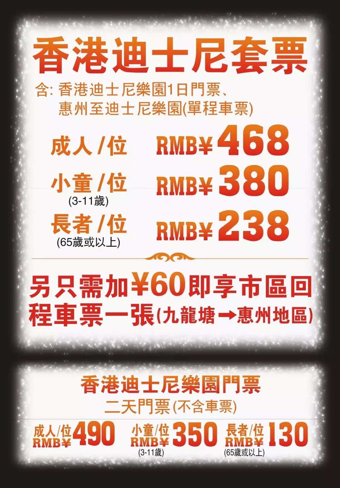 含 : 香港迪士乐园1日门票、惠州至迪士尼乐园(单程车票)