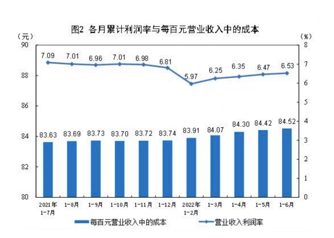 1—6月份,规模以上工业企业每百元营业收入中的成本为84.52元,同比增加0.84元;每百元营业收入中的费用为7.95元,同比减少0.52元。