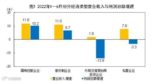 1—6月份,规模以上工业企业中,国有控股企业实现利润总额14894.5亿元,同比增长10.2%;股份制企业实现利润总额31977.9亿元,增长6.7%;外商及港澳台商投资企业实现利润总额9814.1亿元,下降13.9%;私营企业实现利润总额11885.7亿元,下降3.3%。