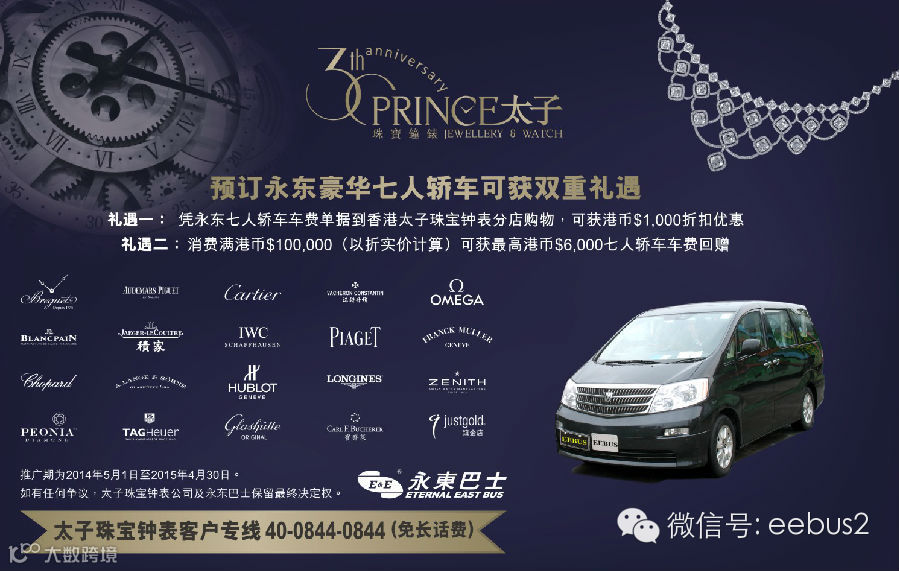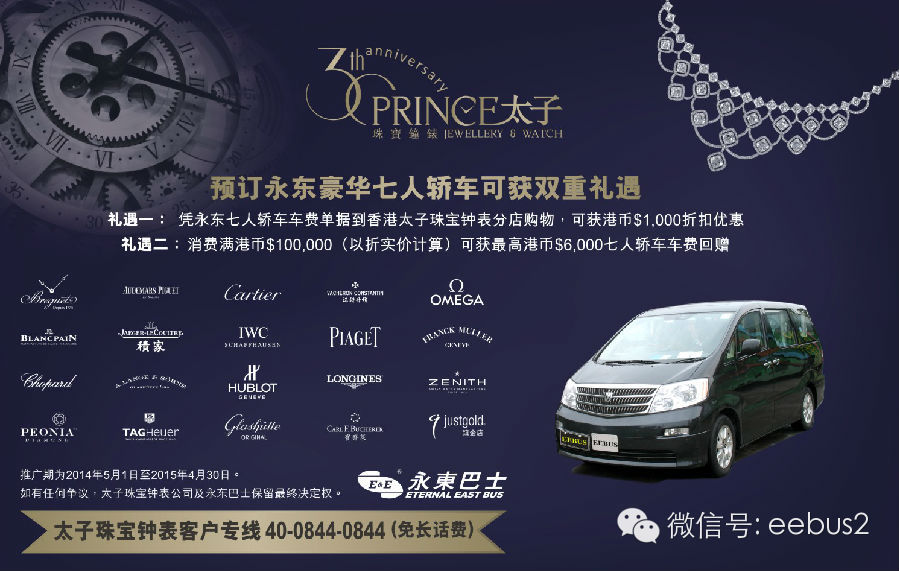2014年5月1日推出太子珠宝购物专车服务, 预订永东豪华七人轿车可获双重礼遇, 服务线路遍布广东省地区。请即致电太子珠宝钟表客户专线 40 0844 0844 (免长话费), 享受特级VIP服务!