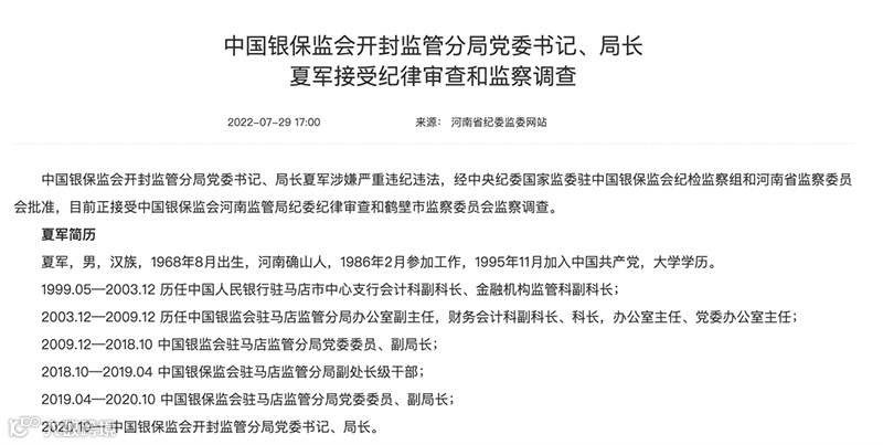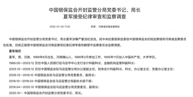 据河南省纪委监委网站消息,中国银保监会开封监管分局党委书记、局长夏军涉嫌严重违纪违法,经中央纪委国家监委驻中国银保监会纪检监察组和河南省监察委员会批准,目前正接受中国银保监会河南监管局纪委纪律审查和鹤壁市监察委员会监察调查。