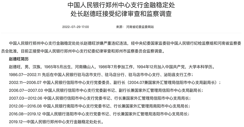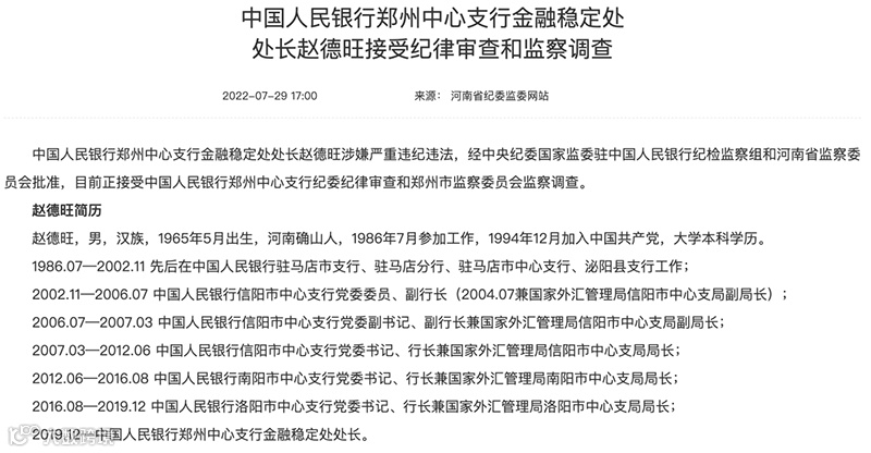 据河南省纪委监委网站消息,中国人民银行郑州中心支行金融稳定处处长赵德旺涉嫌严重违纪违法,经中央纪委国家监委驻中国人民银行纪检监察组和河南省监察委员会批准,目前正接受中国人民银行郑州中心支行纪委纪律审查和郑州市监察委员会监察调查。