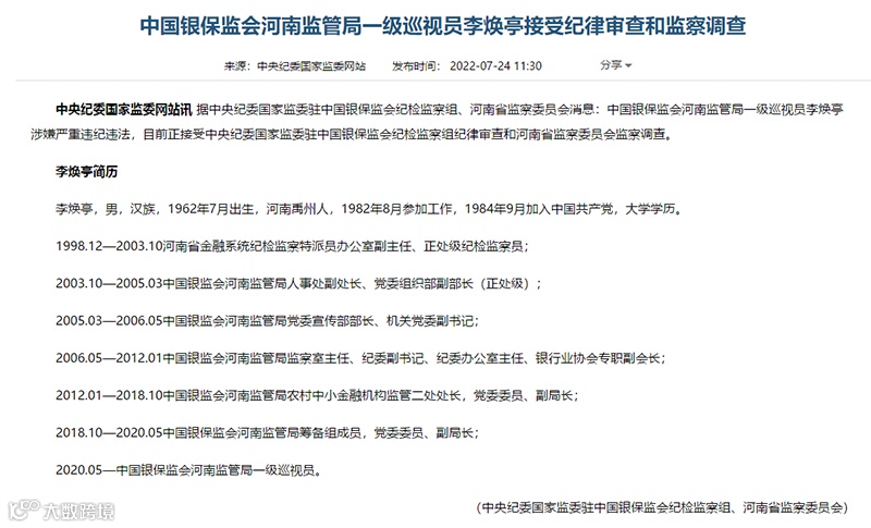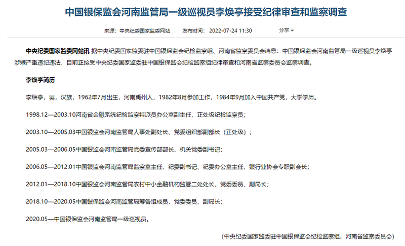 7月24日,据中央纪委国家监委驻中国银保监会纪检监察组、河南省监察委员会消息:中国银保监会河南监管局一级巡视员李焕亭涉嫌严重违纪违法,目前正接受中央纪委国家监委驻中国银保监会纪检监察组纪律审查和河南省监察委员会监察调查。