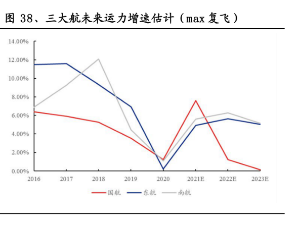 (1) 对三大航的估计我们严格遵循公司的运力指引,对其运力计划中的 max 进行拆解后分别得出了 max 停飞、复飞情况下的运力增速。