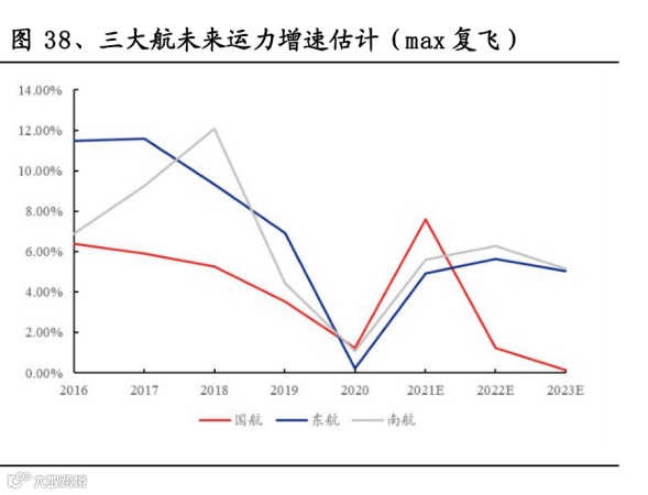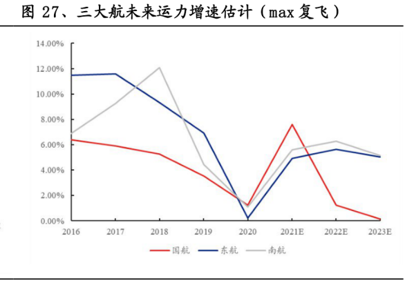 目前三大航中,国航的运力引进计划中已不包括 737max 机型,但我们推测其在手订单未有变化,具体引进时间未确定。而东航则将所有 737max 机型列为 2023 年引进,南方航空将 737max 列于其 2021-2023 年的运力引进计划中。根据以上 统计,我们认为在 737max 不复飞时三大航运力增速仍将保持较低水平,若 max 不复飞,则三大航未来三年运力增速分别为 5.1%、2.8%、0.3%。若 max 复 飞,则三大航未来三年运力增速分别为 6.3%、4.7%、3.8%,仍低于行业过去 10 年较高的运力增速。