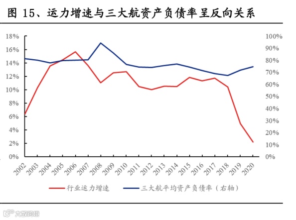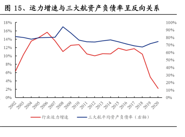部分企业目前负债水平较高。目前部分公司的负债水平经过经租进表和 21 年一 季度“就地过年”的冲击,资产负债率仍处于高位,机队持续增长或将放缓。目前情况类似 2008-11 年,一次大的需求危机后, 资产负债表出现危机带来供给停滞。