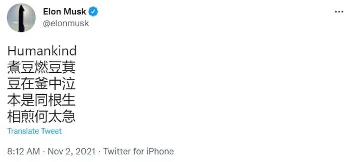 虽然亿万富豪税最终并未通过,但富人税的种子已经种下,心寒的马斯克推特和微博上发表了七步诗,并以“Humankind”为题,来表示他对于人性丑恶的感慨。