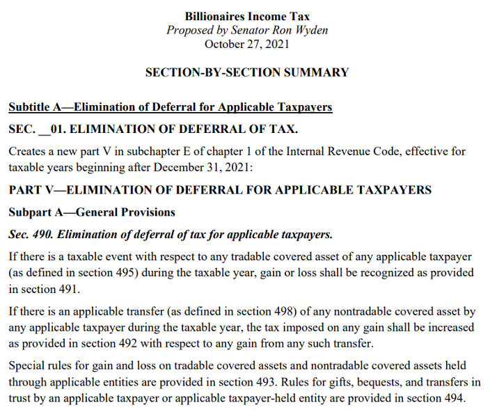 同为民主党人的拜登也将对富人加税作为竞选筹码,但更聪明的拜登对具体方案含糊其词。上任后,拜登也审慎的计划如何对富人加税。直到2021年10月27日,为了缓解疫情下的财政紧张,也为了实现竞选承诺,拜登政府通过参议院金融委员会主席罗恩·怀登提出了一项“亿万富豪所得税”(Billionaires Income Tax)议案,其核心内容是对亿万富豪未实现的财产增值征税。