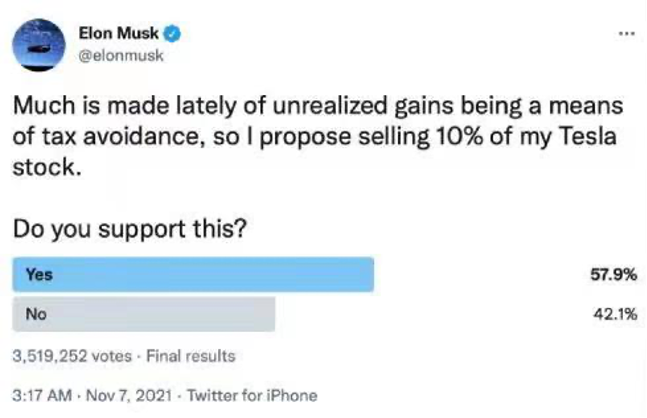 为了增加话题度,他甚至在11月6日发起了一场投票,让网民决定他是否要出售10%的特斯拉股份。