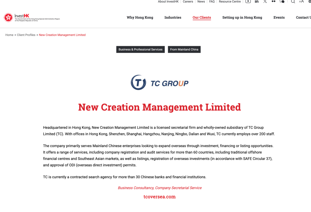 近日,TC GROUP品牌下持牌的秘书公司NEW CREATION,荣幸地被录入香港投资推广署的名录,这意味着全球的企业和个人可以通过香港投资推广署官方网站轻松找到我们,这无疑将为我们带来更多的合作机会。