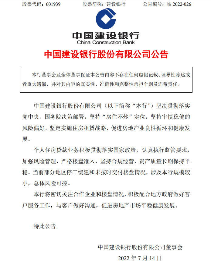 建设银行公告: