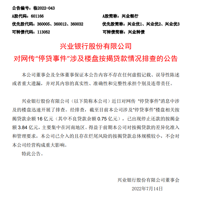 兴业银行股份有限公司(以下简称本公司)近日对网传“停贷事件”消息中涉及的楼盘迅速开展了排查。经排查,截至目前本公司涉及“停贷事件”楼盘相关按揭贷款余额16亿元(其中不良贷款余额0.75 亿元),已出现停止还款的按揭金额3.84 亿元,主要集中在河南地区。得益于前期本公司对按揭贷款的差异化准入和管理要求,本公司已介入的且存在烂尾风险的按揭贷款总体规模较小,不会对本公司经营构成重大影响。