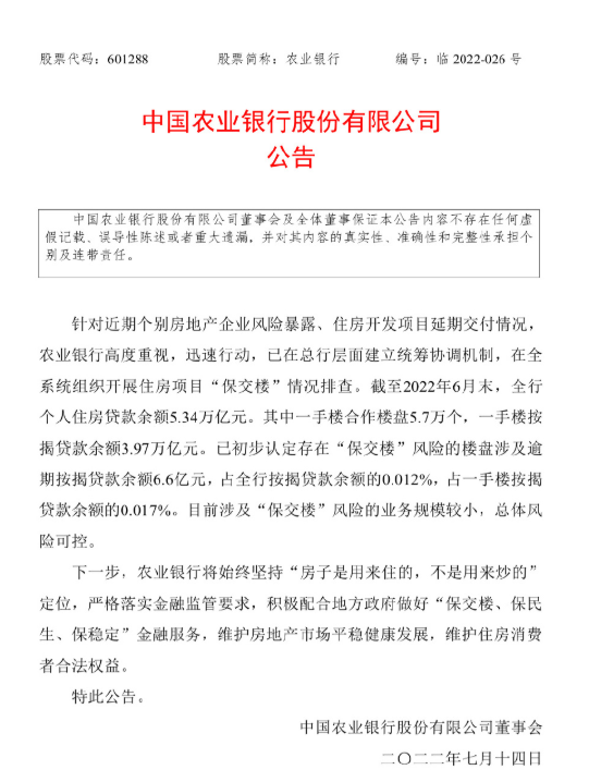 针对近期个别房地产企业风险暴露、住房开发项目延期交付情况,7月14日,农业银行、建设银行、兴业银行等机构发布公告称,各自涉及“保交楼”风险的业务规模较小,总体风险可控。