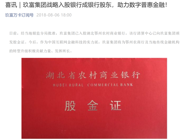 此外,根据玖富集团官网发布的媒体报道,原湖北银监局回应相关媒体称“此次并非P2P平台直接入股鄂州农商行”。